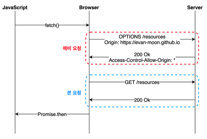 자바스크립트의 fetch API 를 사용하여 브라우저에게 리소스를 받아오라는 명령을 내리면 브라우저는 서버에게 예비 요청을 먼저 보내고, 서버는 이 예비 요청에 대한 응답으로 현재 자신이 어떤 것들을 허용하고, 어떤 것들을 금지하고 있는지에 대한 정보를 응답 헤더에 담아서 브라우저에게 다시 보내준다.