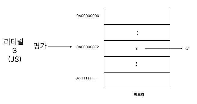위 예제의 3은 단순한 아라비아 숫자가 아니라 숫자 리터럴이다. 사람이 이해할 수 있는 아라비아 숫자를 사용해 숫자 리터럴 3을 코드에 기술하면 자바스크립트 엔진은 이를 평가해 숫자 3을 생성한다.