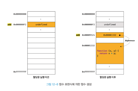 - 변수 할당문의 값은 할당문이 실행되는 시점, 즉 런타임에 평가되므로 함수 표현식의 함수 리터럴도 할당문이 실행되는 시점에 평가되어 함수 객체가 된다.