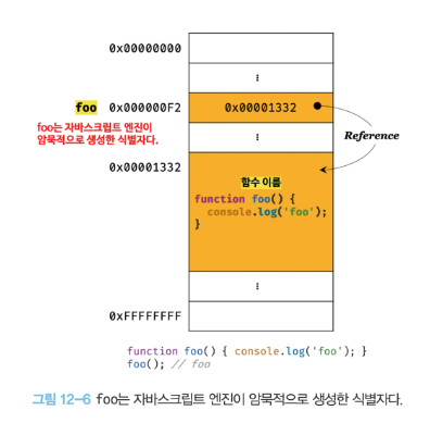 - 자바스크립트 엔진은 생성된 함수를 호출하기 위해 함수 이름과 동일한 이름의 식별자를 암묵적으로 생성하고, 거기에 함수 객체를 할당한다.