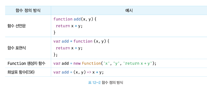정의된 함수는 자바스크립트 엔진에 의해 평가되어 함수 객체가 된다. 함수를 정의하는 방법은 4가지가 있다.