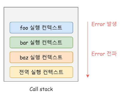 에러는 호출자 방향으로 전파된다. 즉, 콜 스택의 아래 방향(실행 중인 실행 컨텍스트가 푸시되기 직전에 푸시된 실핸 컨텍스트 방향)으로 전파된다.