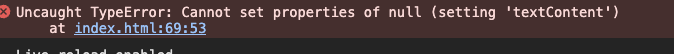위와 같은 에러를 내게 된다. 이 이유는 설정 오류인데, 사용이 되었으나 해당 요소가 아직 존재하지 않아 null을 반환하는 문제인데, DOM에 로드가 되지 않았기 때문이다. 위쪽 코드에서 아직 저 요소가 DOM에 로드가 되지 않았는데, JS를 실행하게 되면, null을 반환하며, null은 textContent을 설정할 수 없기 때문에 에러가 나는것이다. 이를 해결하기 위해서는 module, 혹은 defer의 사용이다.